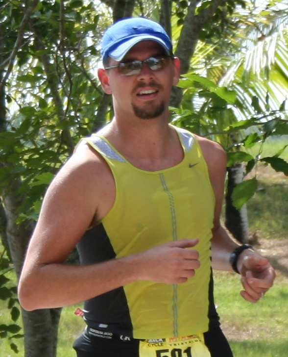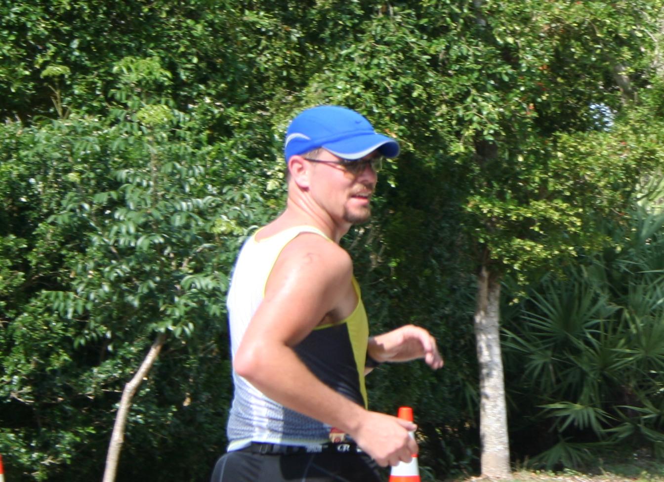 Comments: Jumped on the bike, clipped in, started making the first turn only to realize my back tire was FLAT. Had done all the usual bike check steps the night before at the camp and rode the bike to the race - have no idea how the tire went flat while in the transition area, and didn't hear it go flat after I jumped on.... Did I have a premonition while in the swim that I would get a flat? Maybe...guess this just helped me deal with it mentally. Then the first 2 miles I could not get over 17.5 mph - finally realized the front brake caliper was twisted, and after fixing it was able to pick up speed. Biked mad the rest of the ride which may have helped gain back a little bit of time, but overall figured that these problems cost me about 6-8 minutes. Nutrition worked MUCH better this year - last year was thrown off by the race course not having any of the advertised gel packs and protein bars on the course so brought plenty with me this time. Alternated 3 gel packs with 2 PBJ Uncrustables and a Powerbar, and drank 3 bottles of AminoVital and 1 of Gatorade. Overall was just happy that there was no wind. Despite all the troubles on the bike still was 15 minutes faster than last year's bike for this course. What would you do differently?: Triple check the bike. ![]() Transition 2
