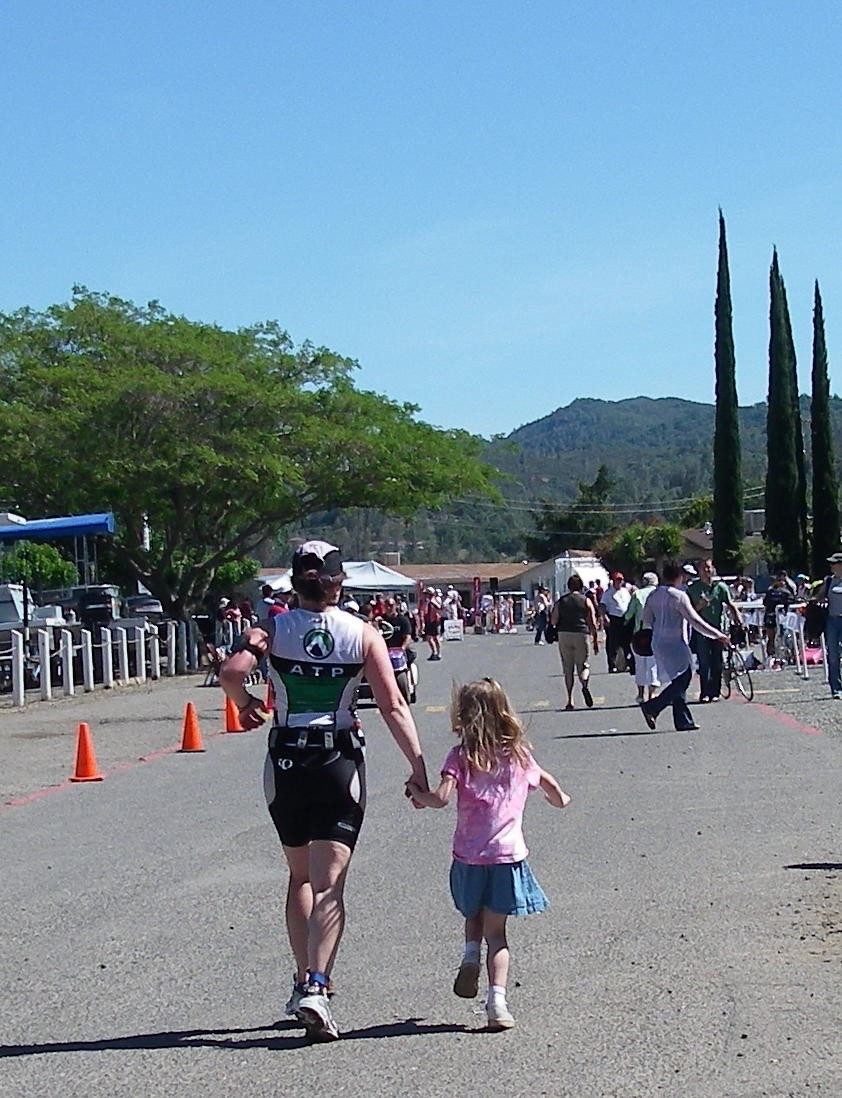 Comments: Headed out on the run feeling pretty strong, and saw Ryan heading out on his second lap--he was in fine form. About 1/3 mile in, I started to get a side stitch. I knew I needed to pee (I had a whole debate on the bike, and decided if I could hold it, it would be better to wait until I was off the bike and could find a port-a-potty than to run in pee-soaked shorts), so I found a port-a-potty and hoped that would help. No dice. Every time I tried to push the pace, the stitch would tighten up and I felt like I would get sick, so I would walk for a bit. After awhile, I started to wonder where I would be in pain if it were appendicitis, since the stitch was kind of low. I decided to jog at a steady, easy pace and see if the stitch would work its way out--not much luck there either. I had a few periods of fatigue, where I probably could have curled up on the side of the road and taken a nap, but those passed pretty quickly. I used my fuel belt instead of my number belt, as I had heard that last year the aid stations ran out of cups and started "recycling." It didn't appear to be an issue this year, so at the end of my first lap I passed off 4 of my bottles to my brother. It wasn't until the return trip on the last lap that the stitch went away. At about the same time, my left calf started to cramp. I ran to the next aid station and grabbed a banana. Majic! With the leg feeling better, I was able to pick up the pace a bit and charge on home! I was feeling great by the end of the race! As I headed into the campground my brother met me and started running with me. He said my niece was up ahead, and if it was OK, she wanted to run in with me. Well, OF COURSE! I grabbed her little hand, and she started running, matching my pace perfectly. She said "Auntie Shannon, we're almost there!" The announcer was in fine form. "Here comes Shannon (mangled last name), and we're assuming her daughter? She looks too young to be her sister...." Right in front of the finish line I yelled "My Niece!!" "OH her niece! It's her niece!" I crossed the line, picked up Kendall, and gave her a big hug. What would you do differently?: Eat a banana earlier to prevent the leg cramp. I had been taking endurolytes, but I guess I needed extra potassium. I still need to figure out that dang side stitch! ![]() Post race