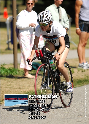 Warm down: Walked 10min to ferry terminal, stretched while waiting for ferry. What limited your ability to perform faster: Wrong turn. Cramps on calves. Event comments: Because of the cold water temperature, the swim was cancelled. Water dropped from 72F yesterday to 56F today because of strong winds overnight. That's too bad as I was hoping to redeem myself after last week's DNF on the swim. Ran and biked well, I'm quite happy. Bike is a PB, even though I lost a minute or 2 when I took the wrong turn. 3rd in AG, best finish this season. No doubt it's because swim, my weakest leg, is cancelled, but I'll take it. Very nice technical shirt. Venue is interesting, but has many logistical challenges. This is the first time organizers try to hold a tri on the Toronto Island, which is generally very busy on the weekend. Seriously doubt they will come back to this venue next year. Last updated: 2007-01-12 12:00 AM