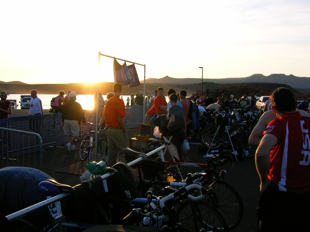 Stretching in the wet suit. Couple hundred yards of swim warm-up.