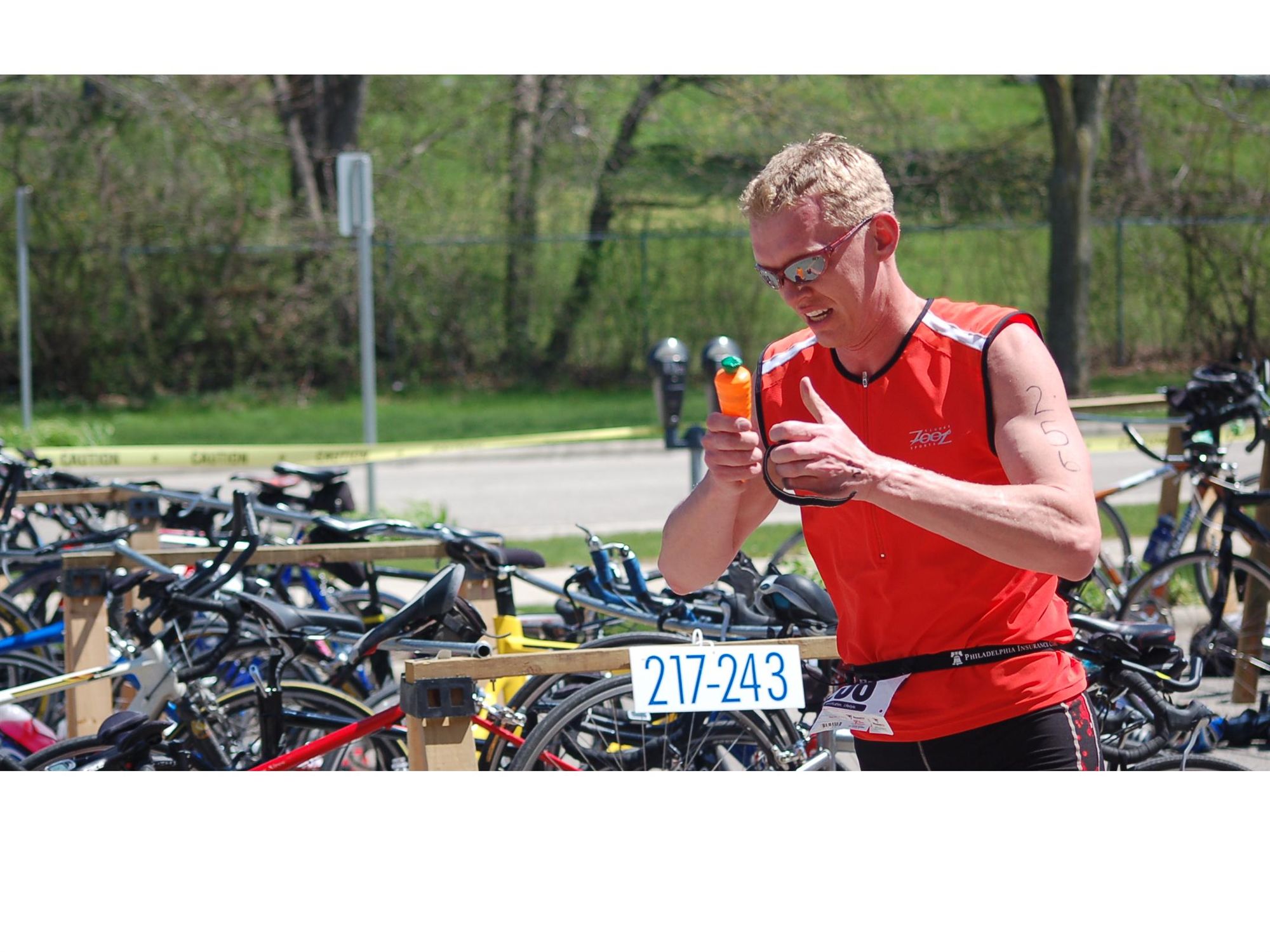 Comments: Ran out the door of the swim building and was trying to get shirt on while running, was hard but did dry leg enough to get my knee brace on quickly. Boom boom boom - helmet, glasses, knee brace go! I have been practicing the shoe entry while riding. It hit a snag again. In Cali, the right shoe popped off, today, the insole got stuck on the foot. Stopped and took shoe off fixed insole, and slid right foot in. Clicked and went. Slipped left foot in over the next 10 secs and off I went. I tried to get Garmin on, but too hard while moving, so left in bento box for the ride. Also, lost a GU when futzin with the garmin, but did have another already taped to the bar. What would you do differently?: Nothing, just get that darn foot in the way I have before - maybe a lil baby powder would have helped. But still real qquick and first time not using socks at all. ![]() Bike