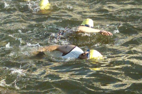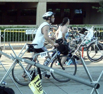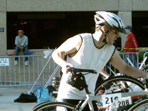 Comments: Oh man! This sucked! I didn't wear a wetsuit. BIG MISTAKE! It was cold, but tolerable. By the time the swim started, I was accustomed to the temperature. But my muscles were contracting. Made it to the first buoy alright. I'm in the middle of the pack. A little kicking and slapping, but nothing too bad. Midway to the second buoy, I get a little cramp in my right calf, but it goes away after a couple of seconds. No big deal I think to myself. Round the second buoy to head in. About 150-200 meters left, and the cramp is back. And it's not going away. I try to work it out, to no avail. So the last 150-200 I do some variation of a side stroke, using my arms only. It takes FOREVER! The cramp just wont leave. I finally make it in, and I cant get out of the water. Can't put any pressure on my right foot. I look down, and there's this big knot a little below the back of my knee. And below it, looks like a pocket of air. I reach down to rub it, and it feels so weird. I get cramps playing basketball fairly often, but they come and go in no more than 3-4 seconds. They never stay, but I'm never in cold water either. So I lean against the rail for awhile (I have no concept of time at this point!) and do my best to stretch it out. In the meantime, this guy is trying to tell me to relax and slow down, which for some reason I interpret as quit. Well I'm not quitting because of a cramp, so I continue to try to work it out. It finally leaves, such a relief! And I limp into T1. What would you do differently?: Stretch better, maybe hydrate more prerace and consume a little more salt and potassium to prevent cramps. But more than anything, GET A DAMN WETSUIT! ![]() Transition 1
