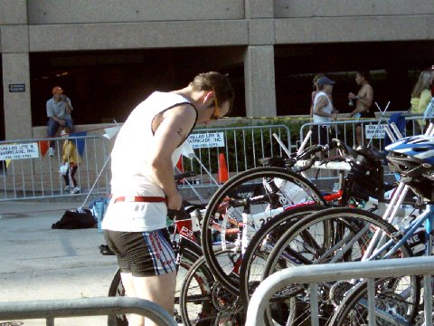 Walk and stretch. Scope out the transition area to make sure everything goes smoothly. Setup my area, and ripped on this one guy for his setup. He stuck his back with the seat on the very edge of the rack, so his tire was hanging out into the middle area. By doing this, he cause all kinds of problems for the guy beside him. Surely an official made him fix this. Saw my old roommate Chris from my glorious days as a college student at UT-Austin. I went 6 years without seeing him, and somehow manage to see him twice in a matter of months. Turns out he's doing the 5k. I tried to talk him into tri, but he would have none of the swim. An evil omen for myself!