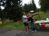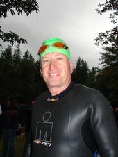 Comments: I was worried about the swim. I figured anything close to 2 minutes per 100 would be great. Seeing this course and knowing I had to go around twice was a bit unsettling. I had done the distance in training, in open water on many occasions so I knew I really did not need to worry, but I still had reservations. About 75 yards in my left goggle filled up with water.... NO! I stopped to fix it, started swimming and 20 yards later it was full again. Stopped AGAIN. I thought this was going to be a LONG swim like this, but this time it was good for the rest of the swim. It got a little rough from time to time, especially at the first turn, things bunched up a bit. Nothing too bad though. Got into a really good rythym. 8 strokes and sight, 8 strokes and sight. Really felt good. With about 200 to go my left hammy started tightening up. This had happened on occasion in training and I got a little nervous about it. Finishd the swim without to much troubles but when I got out it locked up bad. I had to stretch just past the timing matt and pretty much walked to T1, every time I started to run it cramped up and I had to stretch it out. My time range I gave my kids was 41 to 51- thinking 41 would be a SUPER swim, so 43 was pretty much super for me. What would you do differently?: I am going to try to swim with the masters group over the winter. And practice swimming faster. I think that is what I down to. To swim faster you have to swim faster, right?  Transition 1