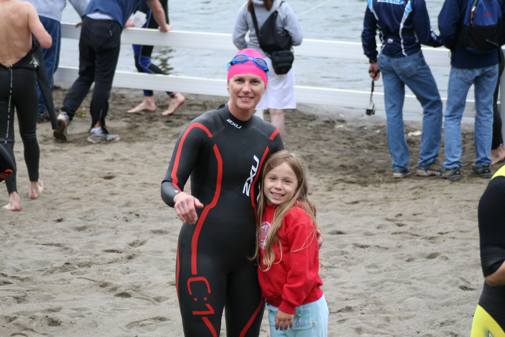 Drank a latte in the car, chatted w/DH, ate a banana and premium bar. Got marked, found my rack, pulled out essentials but couldn't find chip.Got into wetsuit after lubing. Finally found chip after nearly panicking and got to water's edge. Went back to get body-glide for additional application to shoulders. Talked to kiddos, got wedding ring from DH, helped DD find dad in swim wave so she could take pix, got in water to warmup.
