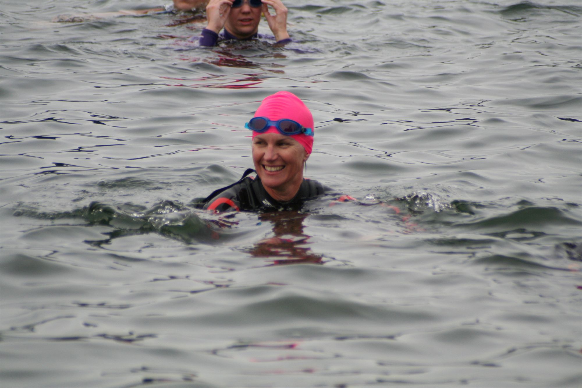 Swam a few yards to get used to water, then talked with other novice women. Swam out to front of pack to start race.