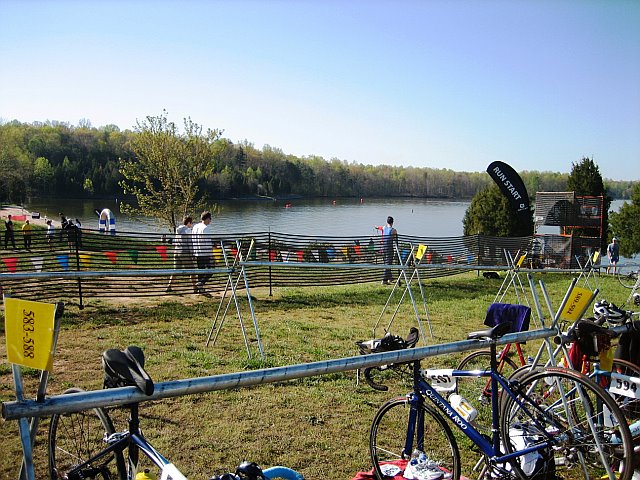 Choked down a Power Bar Endurance (vanilla crisp) for breakfast - gross. Small coffee and some Accelerade Orange flavor for the way down (again, kinda gross, I like the Lemon-Lime flavor better. Apparently they now make Lemonade flavor? I'll have to try.) Got there pretty early, checked in, got all info, etc. Got marked and set up transition area and got familiar with course, transition entrances and exits, and general rules of event.