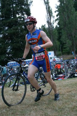 Comments: Waves were assigned based on age group. I'm reasonably good at open water swimming, so I seeded myself in the second row of people. The water was so warm that I regretted wearing a wetsuit. The start of the swim was worse than any I have been in. Immediately everyone crashed into one another. I'm used to being shoulder-to-shoulder with swimmers, but here they were even closer. Elbows were coming up below my chest and face, so I wasn't very thrilled with that. I swallowed a great deal of water in the beginning. About 100 meters in, some swimmers ahead of me fell apart, so I had to dodge some frog kicks. After passing this group the water became clear and I could finally go at my own pace. I didn't draft off of anyone, which is fine with me. I'm happy that I was the 12th man in from my wave, but I'm disappointed in my time. My goal was to break 13 minutes, which was reasonable because my pace in my last Olympic was that fast. I blame the crazy start. What would you do differently?: Move up to the front line next time. Maybe I should work on sprinting at the beginning in order to get away from the crowd. Then I can settle into my pace. Oh yeah, no wetsuit next time. ![]() Transition 1