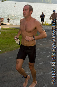 Comments: I was severly limited by my pace on the run. Until the run I was in a dead heat with the 22nd place finisher, Jade Costen. Darn side cramps again acted like a governor on my speed. As I'd increase my pace the cramps would set in, then I'd back off the speed, belch a couple of times, raise my arms over my head and they'd go away. Then I'd pick up the pace and the cramping would set in again. The result was my all time worst race pace on the run. What would you do differently?: breathe / exhale deeper so maybe I won't get side cramps ![]() Post race