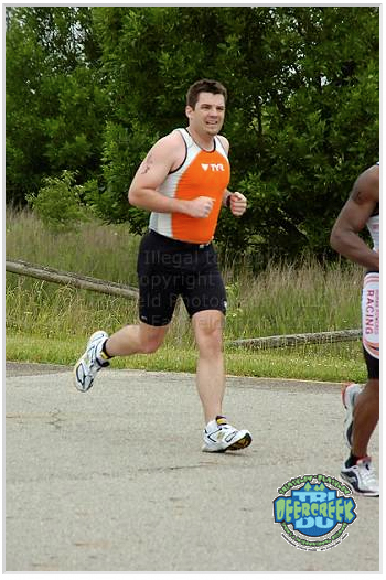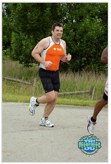 Comments: Well, overall this seemed to be a fine run segment. I started out hustling pretty good, slowed down a bit in later miles, but picked it up and finished strong. I didn't feel overly stressed; I wasn't dying out there, even though the sun had finally come out. It was still a cool and mostly overcast day; I was running without a hat or sunglasses, which I normally have. You know, for the ladies. Anyway, I was feeling pretty good as I started out. I started out running with the phenomenally buff guy that I'm running behind in the pictures below, and I was feeling pretty pleased with the fact that I was running with him, and even passed him for a bit. See, cuz I was feeling good about myself, that's when God turns on the irony: It turns out that he had just done the Triple-T the previous weekend. Yes; he had run three (or more) consecutive sprint triathlons the previous weekend. This international-distance race was his "active recovery". Ye gods. Whatever. I kept running, and talking to people, to keep my spirits up. Saw Phoenix on the way back. Crossed the dam feeling strong, even though I had gone to splash water on my face at the aid station before the dam AND MISSED MY OWN FACE. Oh well. ![]() Post race