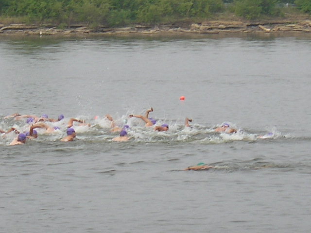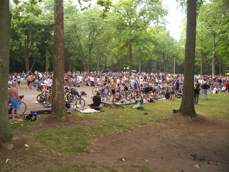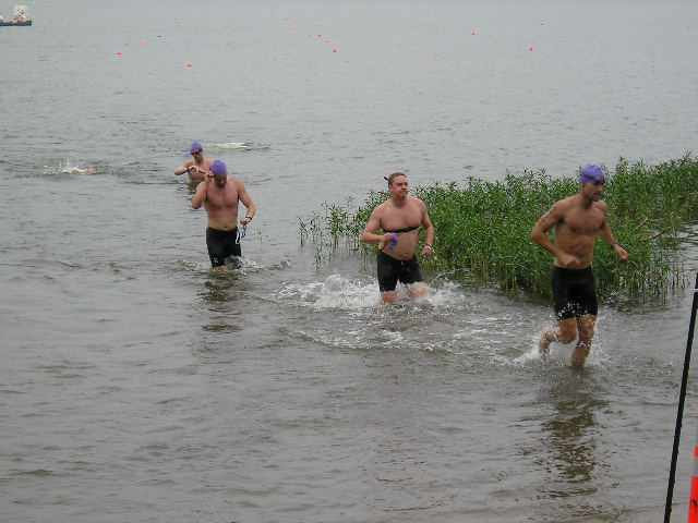 Comments: According to the feel, the swim was WAY long today, more along the lines of 700-750 yards. I don't have any confirmation of this, but I'm pretty sure. I can comfortably swim, in a mob, at about 1:40/per 100 yards. My shoulder has been hurting still from my (hit and run) crash a month ago. MRI was Thursday, waiting on getting diagnosis (torn rotator cuff?) from the doctor. I did not swim as agressive as I could as a result, but that is about 5 seconds/100 yards, not the 20 seconds. I had 1 guy who kept trying to run me over, so I basically let him get on the outside of me, and I just sort of, um, pushed him offcourse with his sighting. What would you do differently?: Since my shoulder was hurting, I should have started further to the left. and stayed left of everyone. I would have added minimal distance, but been easier on my shoulder. ![]() Transition 1