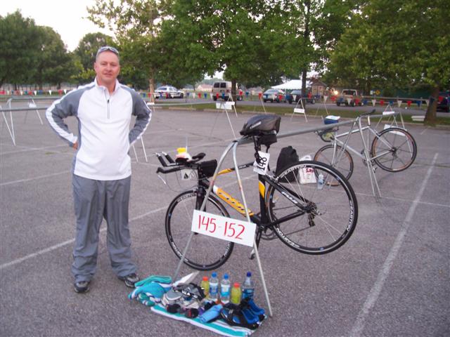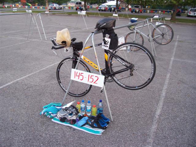 Woke up 5am - Ate 1/2 Raisin English Muffin with peanut butter, 1/2 banana and cup of coffee. Got about 6-ish hours of sleep last night. Got to venue around 6am - was the first triathlete there, so I racked bike in primo spot for our range of #'s - assigned racks, but not assigned rack space - first come first serve for particular rack.