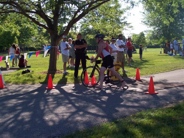 Comments: Race felt FAST on the new bike. I got a little tired on a couple of spots, but, for the most part, I didn't do too bad on the ride. Speaking of the ride, I like the new bike - it's fast!. Plus, I really like the Aero bottle and the Bento box setup. Next purchase is a Chaero Disk Cover for the rear wheel - now that I am riding fast enough to warrant Aerodynamics. What would you do differently?: Ride lots, there is always time to gain on the bike by riding faster. I think I was in pretty good condition today, but I could feel there is room for improvement. I need to experiment with nutrition - I ate 2 Orange Clif Shot Block with Caffine while on the bike, and kept burping it up on the way back. I *may* have had a bit much liquid on the ride too, bit not enough to cause issues. More water/less Gatorade - and need to train with whatever liquid I am going to race with - usually train with water. I also need to ride the tri bike more - I need to get the seat (both the bike and mine) broken in. ![]() Transition 2