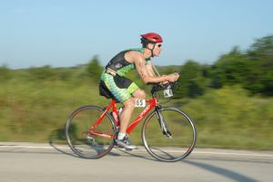 Comments: Way crowded from the start. There were still people running on the right side of the road, so we rode on the left. That, then, begs the question, do you pass on the right or left if you are on the opposite side of the road? Apparently everyone else had the same question, as it was basically a free for all from transition to the park exit. Once out of the park, it was still very crowded. The early wave Sprinters were out on the course as well as the Oly. Good news was that it gave me some motivation to pass people up, but it was still very crowded. Felt great on the way out. Lots of hills, but I was able to spin up them pretty easily. Hit the turnaround and there was a slight headwind. Really started to watch my cadence at during this stage, keeping it between 85 and 105. Kept playing with some guy on a Cannondale. I would spin up the hills and pass him, then he would pass me going down them. Then we came to the Oly turnoff and he went straight as I turned left. Oh well. So long friend. That's when the course got nasty. We turned off onto some random county road. I knew it was a bad sign when all I could see was loose gravel as I turned off. For the next few miles (seemed like 100 miles), it was nothing but dodging potholes, bumps, gravel. Worst stretch of road I've ridden on. At least they were well marked. Still, I was almost ready to DNF. My shoulders and elbows were killing me. Finally we got out on the main road again and I started feeling better. Laughed to a guy as I passed him that we should turn around and ride that stretch again. Then it was back to the park road again and back to transition. Glad that was over. Nutrition: Aerobottle with 1 serving of Inifinit, 20oz Polar bottle, 1 Powergel at mile 20. What would you do differently?: I rode a pretty smart race. I pushed without killing myself, and I was able to joke about the rough parts. ![]() Transition 2