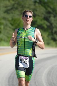 Comments: I'll divide this part up into 2 sections: My race, and the race course. As for my race, it's amazing what happens when you use your HRM. I ran the first 2 miles as slow as my legs would let me, even starting to walk when I got into Z4. Walked the aid stations and did 2 cups of water at each. Had a gel with me, but didn't use it. Felt like I would cramp up with any more calories. The first 2 miles went by fine, then I opened it up a little bit on mile 3. It was hot! I really started passing people at this point. Met Aaron, David (Barron), and David (Gillen) on their way back. Hit the turnaround feeling ok. Drank a cup of water and poured another over my head. Wanted to drop the hammer here, but I held back a little bit. Still had 3 miles to go. Easy there. Met Steve on his way out onto the road and made some kind of comment. I don't even remember what I said. Either something about the heat or the bike course. I dunno. Did my usual motivation trick, trying to pass double digits on the way back. There weren't that many people in front of me apparently, so that was tough. Once I got back into the park and caught up with the Sprint folks, it was easy to go. Think the final tally was 27, but most of those were Sprint folks. I figure 12 of them were Oly athletes. Once I hit the trails again I was flying. Another drink of water, another water shower, and I was ready to go. Didn't even look at my HR number, just did a few distance checks. I was feeling great and was reeling folks in like crazy. Saw Steve (Webster) and Marcy on their way out. Then I caught David (Gillen) with about 3/4 of a mile to go. We had a few words and then I kept going. Finally hit the finish line. Felt like I could have kept going, but was glad it was done. My socks were drenched. Now, the race course. This course was confusing. Once on the trail, there was a left turn at an aid station that was basically a 1/4 mile out and back, then back to the aid station again and take a left. But people were coming from all different directions so it was hard to tell what was going on. This intersection was even worse on the way back. They were telling us to go "straight" here, but from the angle I was coming from, straight was not straight. I had to slow down and try to figure out which way they were pointing. Next, they were telling us to run on the left side of the trail, which is completely opposite of how any normal runner would run. It's always stay right, pass left. Silly planning. Next, at one point in the race, here's what I saw - On a 2 lane park road there was 2 way running traffic in the left lane, people still coming in from the bike course in the right lane, and then vehicles driving (not too slowly either) in the middle of the road. That's not safe. Finally, the aid stations. You have to be kidding me. There was the mindjob aid station that you passed twice in the first mile, then one at the 5K turnaround. After that, there was nothing from the 5K to the 10K turnaround. And you only passed it once. So you have a 1.5 mile stretch with no shade and no water. Then you only pass the station once rather than twice. Then it's another 1.5 miles of hot before more water. More poor planning. What would you do differently?: Nothing. I executed my race plan perfectly. Rather than going out early and dying at the end, I started slow and got faster and faster. ![]() Post race