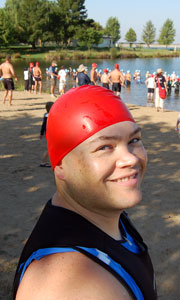 It takes me a while to get my wetsuit on, so at about 8:40 I jogged around a little and got in the water to put the suit on. By that time it was nine and the first wave was about to take off. I swam around for a little bit to get adjusted to the water and get my heart rate up.
