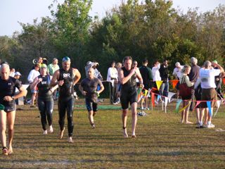 Comments: The water temperature was very nice with the wet suit. Tried to get into the thick of the group to practice for St. Anthony's which I heard is quite crowded in the swim. Well, I didn't seem to be getting anywhere and moved to the outside. I looked up after a while and was swimming the wrong direction! I was by myself! To the far left was the pack. Swam back towards the pack at an angle. Looking at my GPS I was zigging and zagging like a snake on the first leg of the swim. The second and third legs of the triangle swim were a bit better. I felt I should of easily averaged at least 2:00 min/100 yards, but failure to swim straight and settling down at the beginning was probably costly. It was a triangle course and I started to the inside of the first leg. Maybe try the outside next time. I need to practice sighting!! What would you do differently?: Practice sighting as part of training. ![]() Transition 1