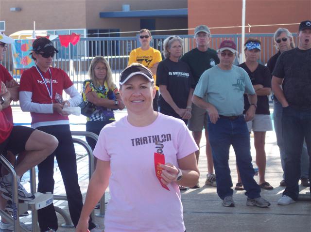 Comments: The run was great. My HR was right at 174 on the run which is where I wanted it. Just below my AT of 179. I had some slightly less fit women pass me in the begining, which irritated me, but I just kept telling myself they were coming out too fast and would fade. Sure enough I passed both by the 1 mile mark. This is the fastest mile split time I have ever had, so I am super happy about it. Last time I did this course I had my fastest mile splits at just under 8 min. Thought for sure I would have a slower run than last year because I am trained up for longer distances now, so I totally shocked myself!!! ![]() Post race