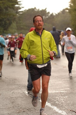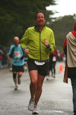 Aaron and I hung together until about mile 2, where I dropped my pace back to 8:30. I was able to keep this pace until about mile 10. I was running in my cycling shell and at this point I started to burn up, so I took it off and wrapped it around my waist. The course began to thin out quite a bit. We continued through the Golden Gate park through very small rolling hills. At mile 6 the sky opened up and the rain started to come down—with quite a bit of wind. About here I dropped a mocha shot block. I continued through golden gate park until we came out onto the Great Highway, which runs parallel to the ocean, at about mile 7. At that point, I got hit with a very strong headwind coming out.