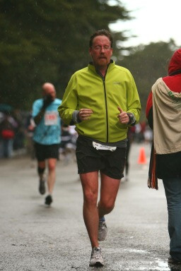That head wind turn into a cross wind as the course continue toward the San Francisco Zoo for the next three mile until mile 10. About mile 8 I dropped my water bottle and had to stop to pick it back-up—much to the chagrin of the other runners! I am happy to say that there were no tigers out and about—but none of us had time to tease the tigers. On the turn-around at mile 10 you realized that the cross wind wasn’t a cross wind off the ocean, but a wind coming off the ocean at a 45 degree angle. The run back was very difficult. The wind I found out later averaged 18 MPH with gusts at 21 MPH. I’ve never been impacted by head wind on the run before! My pace dropped down to 9-minute miles. The rain stated to picked-up again. It really got fun as you hit about mile 12.5. The wind picked-up and it was a tough go for a while. At this point, I could feel my hip get tighter and my knee started to bother me. My pace dropped to 10-minute miles. I hit the turn to go back into golden gate park. What a difference with the wind now at my back. However, I was pretty much spent. The majority of this course is downhill or flat. So what do they do? At mile 13 you have a ½ long hill! I grinded up the hill and came around the corner to the race shoot. It was over! The last mile was 9:25!