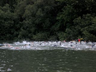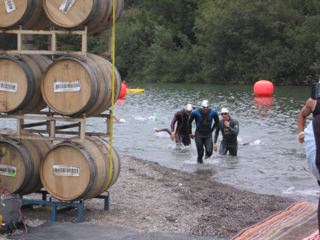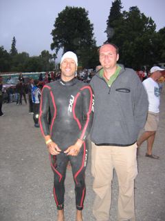 Got up at 4:15; ate raisin bread with banana and PB with some hot tea. Loaded the car with fellow BT'r Geoff W. and headed to Guerneville for the swim and T1. Prior to the swim I downed a hammer gel.