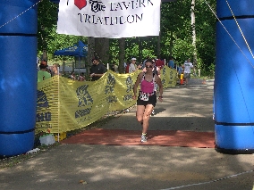 Comments: This course was the craziest run course I have ever seen. It took me several minutes looking at the map to figure it out. The run is 80% wooded in trails. Out along the transition area then onto the path along the river where the swim exit was. From there it got crazy. There were several small foot bridges and some minor hills. Had it not been for the race volunteers I would have gotten all confused. I caught up with Lesa about 1/2-3/4 mile in and passed her. Saw Kristen heading in and cheered her on. Got out of the woods and into a pretty neighborhood. No more shade for a while. I saw Jen just before the turn around, she was headed back in. I got to the turn and shouted for Heed. There was the cutest little boy passing out the drinks. He was probably 5 at the most. I got to the corner and saw a man pushing 2 kids in a stroller. Told the older one to tell his daddy he wanted to be a triathlete. Got back into the shade and took off. Passed Jen. Kept moving. I felt like I owned the run portion on the back half. Once I saw the bench at the river edge I knew I only had about 200 yards or so to go so I really pushed it. I passed a lady in the finish chute too. What would you do differently?: Nothing, this was definitely my best leg! ![]() Post race