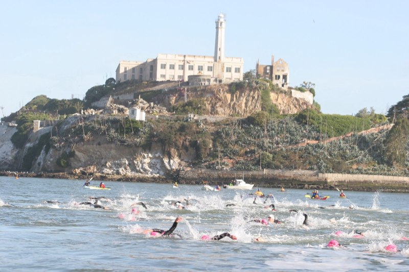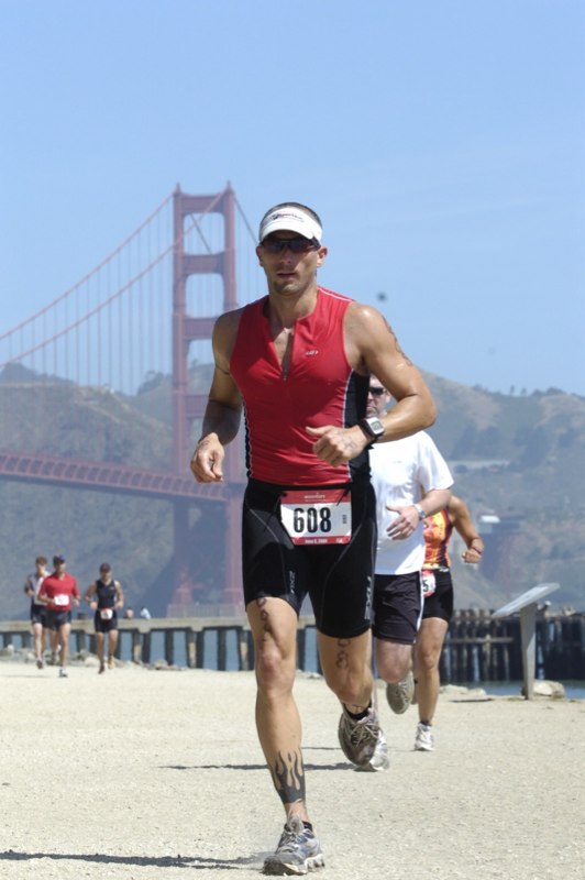 Comments: The boat ride to Alcatraz took approximately 15 minutes. Once we got into position, the race director said a really nice prayer, introduced the professionals, then stared the 1 minute countdown. The horn blew and the pros were off. About 15 seconds after the pros jumped off the side of the boat, it was our turn. The boat had three doors from which to jump and the only comparison I can make to how 2000 people empty a boat in less than 7 minutes is the paratrooper analogy. Same concept ...All you hear Go Go Go Go Go ...shuffle...Go Go Go ... one after another into the 56 degree bay water. It was an amazing feeling and I am so happy that I prepared in advance of this swim by attending a clinic which allowed us to swim the exact course prior to race day. The water was not too choppy to begin with, but as boats circled and as we got closer to shore the waves picked up. I was happy that I only swallowed a few mouthfuls of bay water. It was a rough start and it took my body about 10 minutes to really get warmed up. It was a mad house of a start. I got hit in the face a few times and had people trying to swim over me and at times grab my ankles. I swam hard and felt I hit my LT during the swim ... I came out of the water with a stitch in my side as we began the mile run to T1. What would you do differently?: Add extra yards to my swim workout! ![]() Transition 1