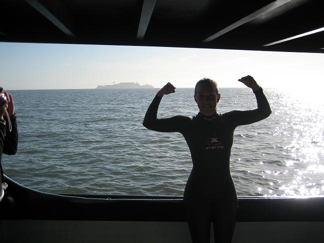 Pretty much sitting around not wanting to talk to people and get psyched out. I got on the shuttle bus to go to the ferry at about 5:20. I dropped off my T-0.5 bag (for the mini-transition at swim exit to allow you to have shoes for the 1k run to the actual T-1). I had put breakfast and an extra drink in my "ferry bag" as well as tons of Aquaphor to prevent a repeat of the chafing from Saturday. I ended up using almost half a tube. After getting dropped off near the ferry, we had to wait until 6:30 to get on the ferry. Finally, we got on the ferry, and it was crazy - just a mass of athletes sitting on the floor of this ferry that's used for fancy banquets, with all their power bars, gels, body lube, water bottles, and wetsuits. I just found it funny. As we shoved off for Alcatraz, I started getting really nervous - mainly because I just wasn't sure how to time it all. I knew the race started at 8am, but the last-minute logistics were kind of overwhelming. I learned shortly before the race start that the pros/elites were going off at 8am, and then it would essentially be 30 seconds until the general start would begin. There were no waves for starts - your race started when your foot crossed the timing mat at the edge of the boat. So it was just mass exodus from this huge ferry. My thoughts - just get the hell off the boat as soon as possible, because the currents around the island are such that when the boat stops and turns off the engines for the start, it will drift further and further around the BACK of Alcatraz (ie, you'll have to swim further the longer you wait). Here goes nothin....