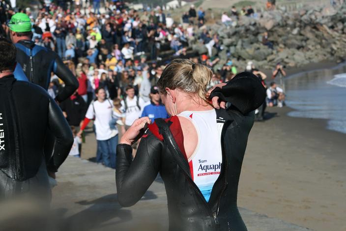 Comments: Ok, I know I said I wasn't going for time, but WTF - there were some fast swimmers out there! Only 6th in my AG? That's crap! Well, either that or it's due to my (in my opinion) crappy sighting. The ebb wasn't quite as strong as my practice swim (reportedly 3.4 vs. the 5.2 the day before). I thought about adjusting my line, but the last thing I wanted to do is end up in the ocean, and since I was told it's better to be too conservative than too adventurous, I decided to stick to my original plan - turns out it was too conservative. The chop was downright nasty at times. I felt like a buoy getting tossed around. And it's also a little scary when half the time, no one seemed even remotely close to me. A lot of people were far to my right (a more aggressive line). I was tempted a few times to join them, but I didn't want to drink the Kool-Aid and end up in the Pacific, so I stuck to my guns. I made it out just fine, and at first, I started to sprint to transition. I stopped myself, thinking, "don't kill yourself, just enjoy this and absorb as much of it as you can." What would you do differently?: Take a more aggressive line. ![]() Transition 1