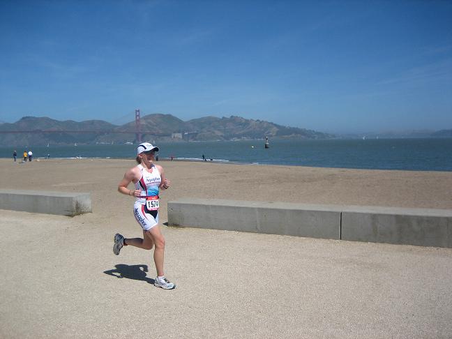 Comments: You may look at my time and think that this wasn't a fast run for me. Oh how deceptive that time is. Take into account the fact that this run course seemed more like an XTerra course than a normal tri course, a half-mile portion being on the beach, the sand ladder, and the fact that a significant part of the race was on a path wide enough for exactly two people (one out and one back), and this run was fast. Granted I did walk up some of the stairs (that were too steep for me to feel safe running), a small portion on fresh wood chips because I couldn't get good footing, and the sand ladder - that needs no explanation. So those things considered, I would estimate that I was running at a pretty good clip when I was on firm ground. Now to the important part - the views. Oh my God. I can't even describe it. The course starts with a run toward the Golden Gate Bridge on a really nice packed gravel path. Next a small staircase up to an off-road path with random ups and downs, a very low-clearance pedestrian "underpass" and then a climb up to the top of a hill right before the turn-around point at Baker Beach. The downhills were so fun, and I knew we were coming up to the Sand Ladder, so I was trying to rest up. Little did I realize that the beach run portion was immediately before it! The run on the beach is what made me so glad I wore socks. The tide had started to come in, so there was very little non-soaked packed sand left to run on. But everything was so beautiful, I never felt like I was getting tired. I could just go on forever. I walked up the sand ladder, trying to take the steps two at a time during portions, but that thing sucked. It must have been 100 steps. And all you have to step on is loose sand or mini railroad ties. Whatever, at the top, I had conquered it! The "prize" for getting to the top was Cliff shot blocks - Pina Colada flavor. That flavor never appealed to me, but (this is gross), I must say that they were hot and gooey, and they tasted AWESOME. The rest of the run was a complete breeze - majority downhill, and I was FLYING. The views and gorgeous day was like a constant energy boost. I can't imagine being any happier or being any more "in my element" than on the home stretch of the run. Words can't describe how enjoyable the run was - despite the complexity and difficulty. It was truly amazing. I saw Thomas taking photos as I got back on the gravel path that I knew was less than a mile from the finish line. What an incredible feeling. I didn't want the race to end. I crossed the finish line, arms in the air, because this Texas flat-lander came to conquer Alcatraz, and not only did I do it, I enjoyed the hell out of it. What would you do differently?: ABSOLUTELY NOTHING. ![]() Post race