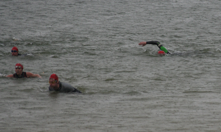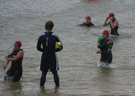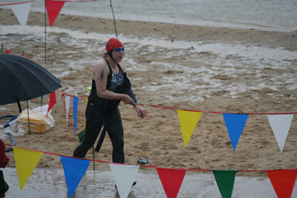 Setting up transition. Trying to keep everything dry. Got on the wetsuit and booties and headed down to the beach. Got wet, took a few strokes. Cold! Hung out until my wave (8th and last) went off.