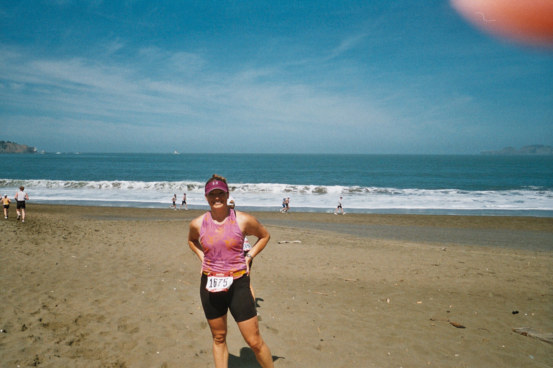 Comments: My legs felt DEAD for about the first 4 miles. I was actually very concerned that I couldn't do this. I took a gel and had Cytomax at every stop. Came to a set of stairs and thought, hey, this isn't bad! Just walked up while others were running down (those darn fast people). I took pictures the whole time, even of Melissa taking a picture of me, and of Russell and Lubin whom I saw on the course. Finally at the top of the trail (this long single tracked trail that was really "rooty" and rocky, not easy to run on, we got to be on road, down hill, and my legs got to open up. A trail down to the beach, where I had to take a picture. I had never seen the Pacific Ocean, and it was spectacular. This guy heard me say that, and offered to take my picture. As he put it, winning the race wasn't looking like an option anymore. :) Then a mile run on the beach, and then the dreaded Sand Ladder. Really interesting. Just logs on a huge sand dune. I found a fun group to "run" the steps with. Then a woman that was an Elite blew by us running up the steps. Awesome. Apparently she had a bad bike and got caught way behind, but she was awesome to watch on the steps. I met up with a really nice girl named Laurie from LA to run the rest of the course with. She was a rider growing up and she had been having IT band issues, and we had lots of fun just chatting taking it easy. Of course she outsprinted me at the chute, but I didn't really care. I was trying to find Melissa and wanted to give her a hug then run through by myself. What would you do differently?: Run lots of hilly trails, and run steps at a stadium! ![]() Post race