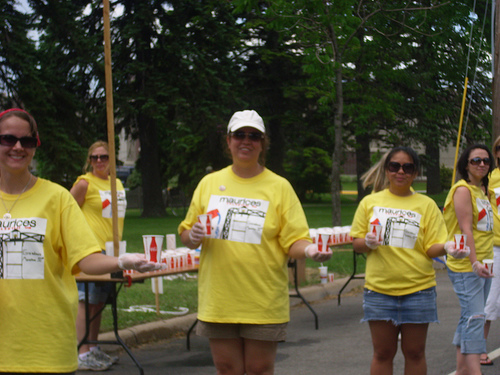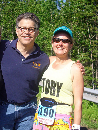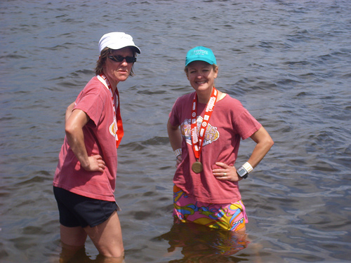 Warm down: As soon as we hit the finish line, God blessed us with a drenching rain. No need to shower now! LOL! Since our legs were really tight, we'd agreed during the run to go and walk into the lake after the race. Since it's so large, it never really warms up and we heard it was about 43 degrees. So after grabbing some food (ice cream...man oh man that ice cream was good, for me and a bagel for her) we made our way to the beach and waded in. HOLY CRAP it was cold, but let me tell you. I think it made all the difference in the world! Honestly! My legs felt refreshened afterwards! We went back to the hotel and showered and rested a bit before heading back into Duluth to eat dinner at Little Angies. Even there they welcomed runners, with eat wait person wearing a shirt that read, "I ran once. I was quite proud of myself." Oh, one thing that was interesting...we got to keep our Champion Chip! So now I have two. One from Grandma's and one I chose to keep from NYC! Event comments: I would definitely give this race 4 stars, reserving 1 star because of the anti-MP3 stance they take. I could go on about how ridiculous I find it that someone tells me that I can't listen to my own music on a race that, on a good day, is going to take ME at least 4:45, but suffice to say I would not have registered if Kim hadn't wanted to run it. I'm so glad she did because Grandma's definitely ranks as one of my favorite marathons in the 12 I've run. It wasn't overwhelmingly big like NYC (and I loved NYC), nor was it lonely like Seattle. It's like Baby Bear's porridge...just right. The course support is amazing, and the community totally gets behind the runners. There were signs welcoming runners all over Duluth and Proctor. The newspapers had articles two days leading up to the race (big articles, too...not like the 25 word blurb I saw on the Seafair Marathon that I'll be running Sunday...thanks Seattle. You really know how to make runners feel valued.) The paper also had a HUGE section on the marathon with EVERY single finisher listed in it the day after the race. The hotels went out of their way to make us feel welcomed, which isn't always the case. We were even offered the opportunity to reserve a room for the following year. The transportation was outstanding to the beginning of the course (bus left right from our hotel). The festivities were well planned and organized. The restaurants the day before all catered to runners (I think I counted at LEAST four carbo-load "feeds" in the restaurants we walked past) both before and after. You know what the BEST part of a marathon is, though? The people you meet on the route. More than once we'd pass people on the side of the road (over 200 didn't finish) and someone near us (or us) would ask if they were okay. At one point this happened and I said to Kim, "This is why I love marathons. People are always so GOOD to each other on marathons!" The lady who I was referring to agreed and we had a nice chat then, and again at mile 26 when she said to her husband (who was running her in) "If I mention doing Grandma's again next year, you have my permission to slap me...I can't take this heat!" I replied, "Oh you know you'll be talking about it within two months." "Yeah, you're probably right...but this heat!" I invited her to join us in Seattle where not only would she NOT run in heat, but she might get rain, wind, or even SNOW and LOTS of hills with zero cheering spectators! Some of my favorite moments on the race: 1. The F-16s flying over. I love the sound of loud planes and I always find things like that very moving. 2. The kindness of the people in the medical tent, not just the volunteers but other runners who were consoling each other for having to drop out. 3. The homemade wrought iron dinosaurs in front of a house, one of which spewed flames. This family was busily setting up a water stop for the runners, so I got a chance to tell the guy who COOL I thought his dinos were! 4. The many MANY times people yelled my name on the route, especially the drunken frat boys chanting my name over and over again. I'm telling you, you gotta put your name on your shirt! It makes SUCH a difference when you're staring down the wall to hear someone say "You can do it, Tory!" 5. The line of trolls on the ground "for luck". 6. The yard filled with flamingo statues. What was THAT all about? 7. The many people with sprinklers, hoses, and even water guns! 8. Al Franken giving me a HUGE hug and a kiss on the route! I love Al Franken! 9. The wind coming off the water providing us with much needed heat relief! 10. Running with my sister. That was the best. We're going to have to do that more often! (Plus she "gets me" and doesn't think I'm insane at all with all this marathon stuff.) Last updated: 2008-02-17 12:00 AM