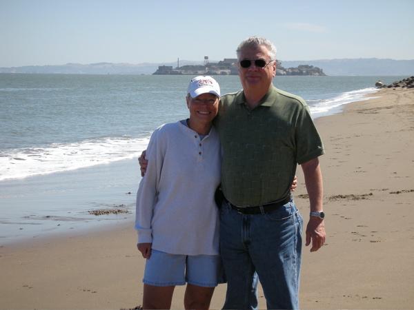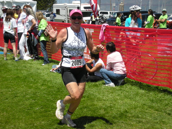 Comments: Swimming in the Bay is pretty awesome no matter what your course is. It's beautiful. It's challenging. It's fun. I really like it and wish I had the opportunity to do it more often. The tide didn't seem to be working quite as much in our favor this year as it was last year, but my overall swim finish time was similar. I was decent with my sighting in the beginning. I sighted off the Fontana Towers for what seemed like forever and then the Fort Mason buildings came into sight and I worked off of them for awhile. Then in the last third of the race, when the Palace of Fine Arts dome finally came into view, I kept swimming a bit too far to the left. I only sighted every few strokes to try to stay a bit smoother and it was amazing how far to the left I would start moving in that short time. The water was smooth as could be when we jumped off the boat and then part way through 2 foot plus swells started washing over us. I wondered if it was a power boat, but someone told me later a huge barge was crossing the Bay on the other side and it was likely from that (although supposedly they close the Bay off for the swim...). There were tons of people when I first came off the boat, but I still managed to keep track of my mom for a minute or so. Then a couple of people swam between us and POOF. She was gone, just like that. Knowing they wouldn't let anything happen to her, I went on with my own swim. In the middle of the swim the field seemed to spread out quite a bit and with the big swells it was hard to see where the kayaks were, or anyone else for that matter. It felt a bit lonely at times. I was able to stay on track decently though. In the Bay you can tell when you get near shore as the water temperature drops even a few more degrees than out in the middle of the water. It got distinctively colder a couple hundred yards out and the last 200 yards seem to take forever to get to shore. I swam and swam and it seemed like the shore didn't get any closer. When I finally did step on solid sand, I had really enjoyed the swim but was glad to be moving on with the rest of my race. What would you do differently?: Sight better in that last third of the swim. ![]() Transition 1
