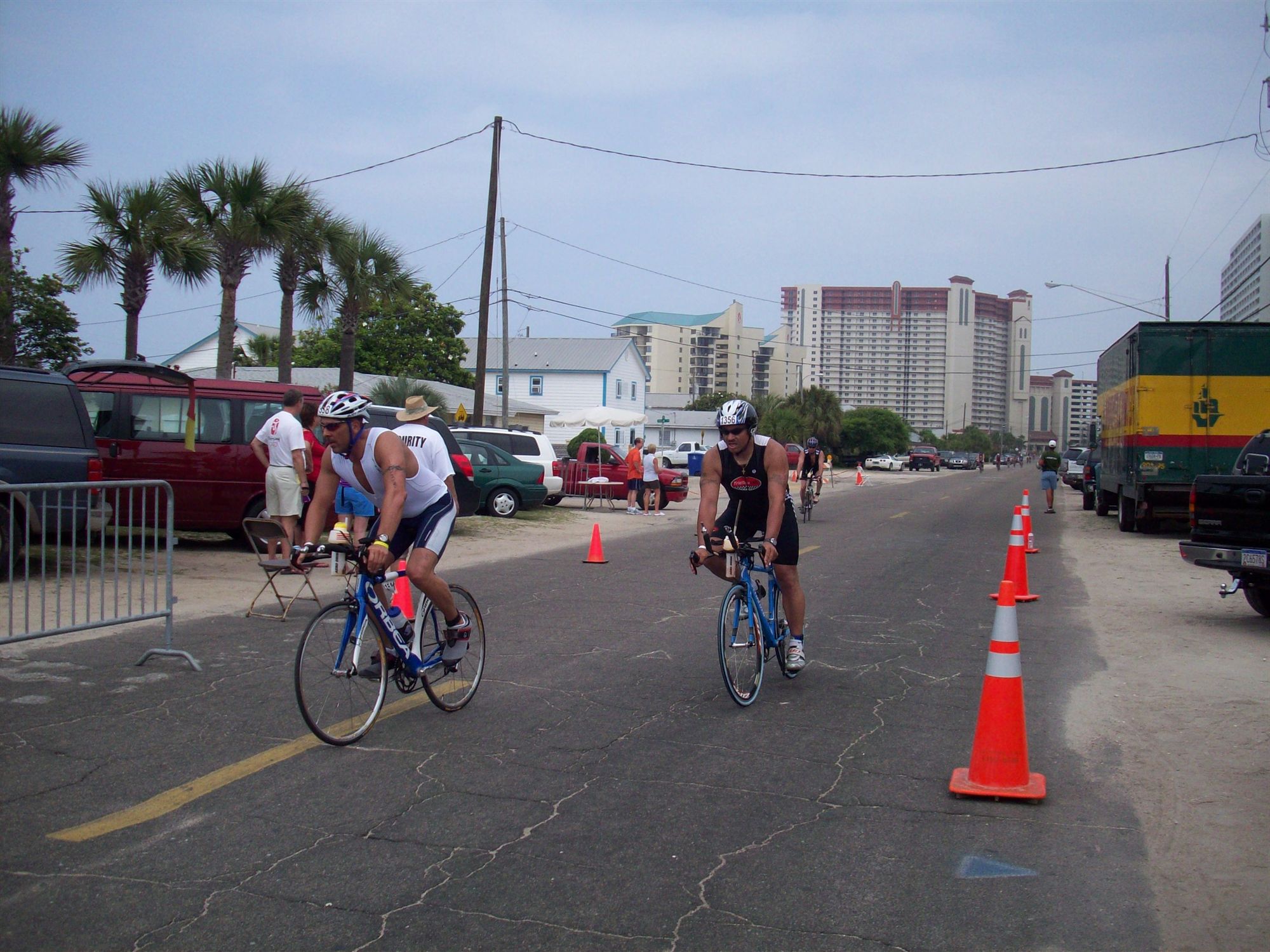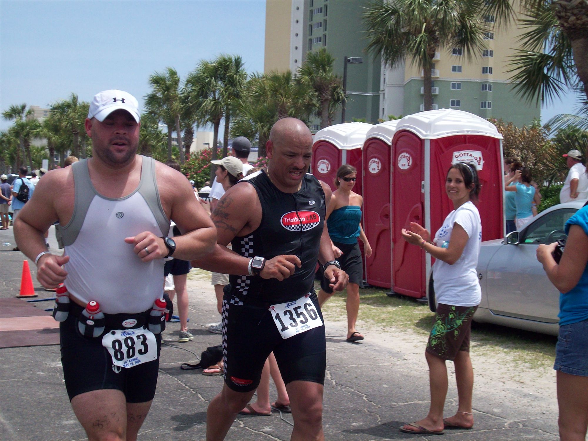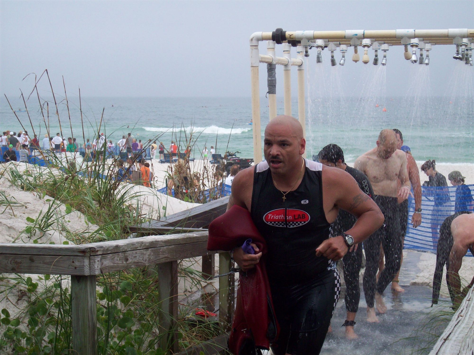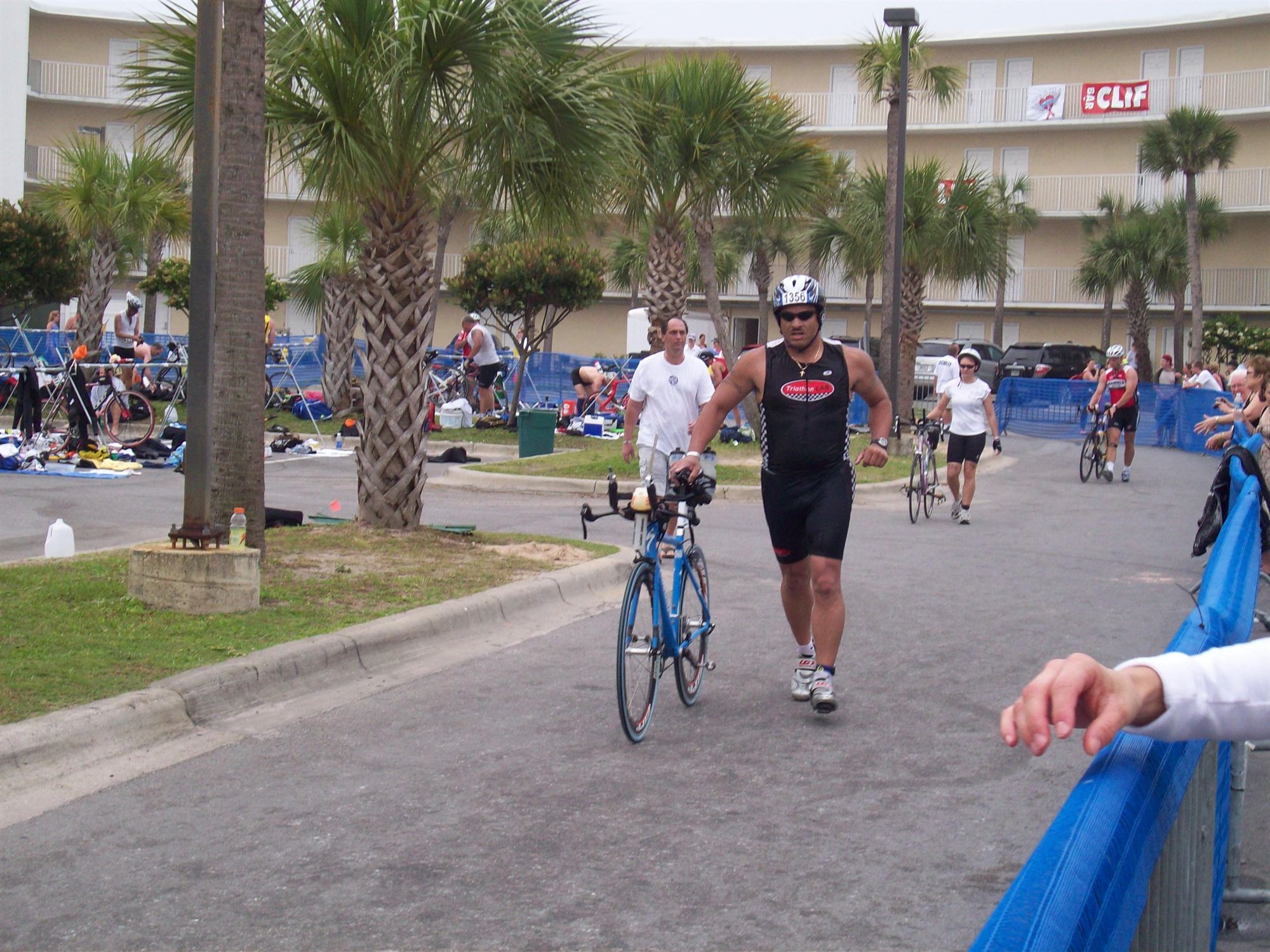 Comments: I stopped about half-way to the 1st buoy (about 100 meters) to orient myself and saw that all the swimmers were all over the place on both sides of the buoys, so I just decided to swim as close to the buoys as possible. This worked for the first 950 yards out, but navigation was HORRIBLE due to the constant waves!! I noticed another fellow wave swimmer struggling a bit next to me, I asked if he was OK, he replied yes and then I swam forward – don’t know what the heck I could of done for him but it sounded good – right?!? Along the way, I had many moments where I battled the mental demons but I repeated to myself two things “Rivi, swim to the bike, Jesus is with me, swim to the bike, and Jesus is with me…” Got to the 3rd buoy, looked again to navigate for the orange turn buoy, but again navigation in the washing machine was CRAZY!! Sucking in lots of Gulf water, feeling completely overwhelmed by the waves, feeling disoriented at times, etc. (are you picturing this??) I finally made it to and around the first orange turn buoy, and realized after a bit that I was off course too far, managed to swim back left and got swam over by another swimmer – who then yelled out some explicative --in frustration I suppose but – Oh Well! About midway to the 2nd turn buoy, I couldn't’t see the orange turn buoy, asked one of the lifeguards who directed my sight but it wasn’t until I was pushed up to the top of a few waves that I could finally see it in the distance, so I swam forward. Again, repeating “Rivi, swim to the bike, Jesus is with me, swim to the bike, Jesus is with me…” After making it around the last turn buoy to swim the last 950 yards back to the beach was very difficult because apparently some of the last few buoys, particularly the last orange buoy on the line, had dislodged from their position and had drifted way off course and I was definitely no where near them like I was on the first 950 yards out. I then used some logic and visuals and decided to focus and swim towards the large hotel building on shore. Thanks RT for that little tip of information. Soon after that I could see the blue netting of the exit corral each time I was pushed to the top of the waves (and the buoys were STILL WAY off to the left of that, mind you). The only encouraging and calming thought was that the hotel building got progressively larger and larger in my line of sight as I continued to swim so I slowly became more calm and managed to get my heart rate down just a little bit. As I neared the end, a couple of times I could feel sand in my fingers so I would try to stand up but – “OH NO, no flooring, keep swimming further Rivi!” After a few times of this I just decided not to attempt standing until I could scoop sand with both my hands on a full stroke, finally I was able to stand! The next thing I heard was my biggest cheerleader yelling “There’s my Ironman!!, You Go Papi!!, You made it Baby !!, YOU DID IT !! (I found out later why she was extra happy and extra loud when I came out of the water, so I’ll explain later in the report) Coming out of the water I was unbalanced and disoriented but VERY glad to be on stable ground – so much so, that I took a moment to bend down a few feet into the entrance of the corral shoot to touch the sand in gratitude to the “big guy in the sky” for getting me through it! What would you do differently?: Overall, this was a tough swim for everyone. I need more open water swim but when it's all said and done. I can swim with a wet suit and I know I can swim without one also. That's the next step of my journey. ![]() Transition 1