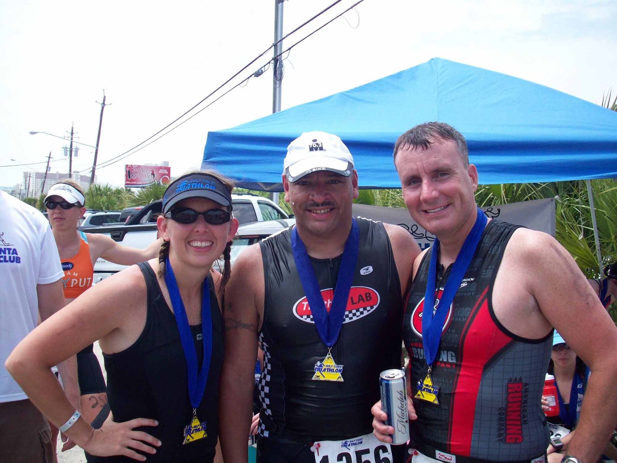Comments: By this time, the sun had permanently positioned itself securely in the sky above us with the sole purpose of beating us down !!! Along the course, the volunteers supported us at the highest level possible !! There was an abundance of water, Gatorade, soaked sponges, fruits, and even coke on the way back (Amy Shay you would’ve loved this !!) The first familiar face I saw on the run somewhere past mile 5 was Rebecca (previous GFA swim coach), then RT. During the first few miles of the run I need to find a Porta John. My wishes came true around mile 3. I stopped at “Porta-SAUNA” a/k/a Porta-john to pee – when I finally got out of there I felt like I stepped into the A/C because it was sooooo incredibly hot in there, but that A/C feeling wore off in about 30 seconds as the sun regained its hold and continued the beat-down with 88+ heat and humidity! Then about mile 5.5 I heard Debra Priest yell for me, then saw Aimster; then thought to myself “hey, I can catch them!” – NOT !!! I mistakenly thought that the turn-around point must have been just ahead, but by the 6th mile mark, I realized there was no turnaround between Debra, Amy and myself so catching them was not an option. The turnaround was non existent and prefaced by a loop around a park that was nothing but swampland, sand, and just PLAIN HOT!! Soon thereafter ran into another water stop and a photo guy. I then heard a fellow runner let out an explicative (something along the lines of F$&%, because he was just caught on film walking. He started running a bit with me as we passed the camera, then he quickly fell back to walking. DID I TELL YOU IT WAS HOT ???!!! Note to Self: In this kind of heat, don’t throw away ice water after drinking it, keep the cup and run with it so you can sip cold water periodically. Just before leaving the park, I noticed a volunteer slathering on sunscreen lotion on runners who wanted it. I positioned myself to be next in line up ahead but another runner slid right into my path so I just kept going – figured I was already burnt, what the heck ?! About Mile 9 I saw Barbara Sarver; we exchanged some words of encouragement. Also, drank coke for the first time on a run – hey why not, Chad’s done it. It was not to far after mile 9 that I realized I wouldn't’t make my sub 6 hour goal thanks to the heat, but decided to finish strong regardless, so I stayed steady, drank every time available, took sponges, Gatorade, and water over my head at every opportunity. [Remember: “Manage Your Race”] Just after Mile 12, I was passed by two Relay chicks - made me mad !! Why? Until this point I had only been passed by 5 runners on the run, they changed this to 7 runners. Next mental markers were going to be passing the All3Sports tent, then listening for the North Atlanta Multisport cow bells – then I would only be 1/10th of a mile to the Finish Line !! Not soon enough, I could finally see the first mental marker, then I could hear the cow bells and the cheering, then I could see RT and Amy near the tent w/ beer in hand and all smiles. I was oh so close! In the final 1/10th, I heard Shelly cheer me on and reminding me to kick in gear with high knees, then finally I could hear and see Anica jumping and yelling to bring me home!! It was then that I realized how close I was to that Finish Line and that the big guy running next to me was too close to me and was going to mess up my finishing picture! so I decided to quickly PASS HIS A--!! Had to secure my photo op at Finish!! Crossed the Finish Line with nothing left in my tank, got my medal, was escorted to the chip return, grabbed an ice cold water bottle, and went over to Anica who handed me my NEW 70.3 Hat !! We had agreed I would not wear it until after I crossed and OH, how sweet it was. I AM A HALF IRONMAN!!! What would you do differently?: Take sunglasses and hat on course. Overall I had a good run, I managed the race and respected the distance. ![]() Post race