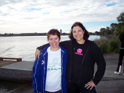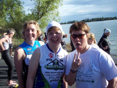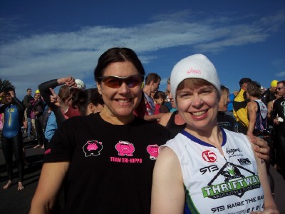 The women's race started 20 min after the men's, so that gave me more time to put on my wetsuit with plenty of bodyglide and triple check that I had everything in transition. The racks were tight but I could live with that. Ate a gel when the men started, and had some water. About 5 min before our wave started, I got in, made sure the suit was comfy and that the goggles were watertight--by putting my face in the "oh, so cold" water! Really, it wasn't feeling that bad. I was full of adrenalin and just wanted to get started-I'd been looking toward this race for over four months, let's go!!!! Hugged Lynne and we were on our way.