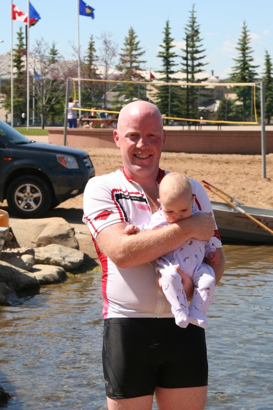 We drove to the site, parked and I rode my bike ahead carrying my trans bag as we were running a bit behind. Found a spot on the racks with FOUR bikes on it. Most of the others had 6 or 7. The elite on the end was taking room for 3 bikes and he had virtually no gear on the ground. A few others moved over and I got my stuff out. Got changed, met up with Mrs. and baby Khyron and watched the tri-it people go first. I found it quite warm so I waited as long as possible before putting the wetsuit on.