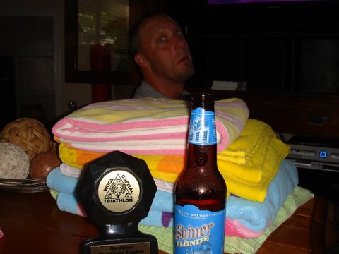 Warm down: Bent over to gave thanks for the race being over. What limited your ability to perform faster: Running Event comments: I think that was the hardest Olympic race I have ever done. However, it's a very small race (less than 150 people) and it's run by one of my favorite race directors (love him or hate him- Jack Weiss). I am glad that I did the race and very excited that I got a trophy for second in my AG but I don't know if I would go back. It's a 3.5 hour drive from Austin, it's hot, it's windy, the bike course was rough with long sections directly into the wind and the run was just brutal. I know the race is known for the "Dirt road from Hell" but what they don't tell you is that dirt road is over some pretty tough hills. There is practically no post race activities but the race site is a nice place and we really enjoyed the company we were with. Who knows, maybe I will go back to see if I can knock off the 1st place guy... Last updated: 2008-05-28 12:00 AM