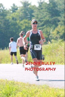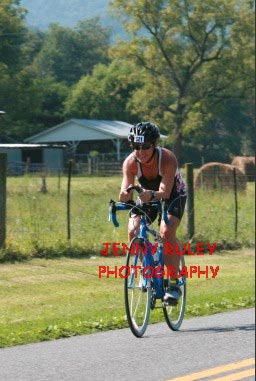 Got up at 4:30am, had some PB toast and a banana. As I was driving over to Luray, the full moon was still up on one side of the car and to the left/rear, I could see the sun coming up. Very cool. Arrived at the site with tons of time to do packet pickup, get body marked, etc, etc. My goals for this race was to do well on the swim - calm and swimming my race, and improve my transition times.