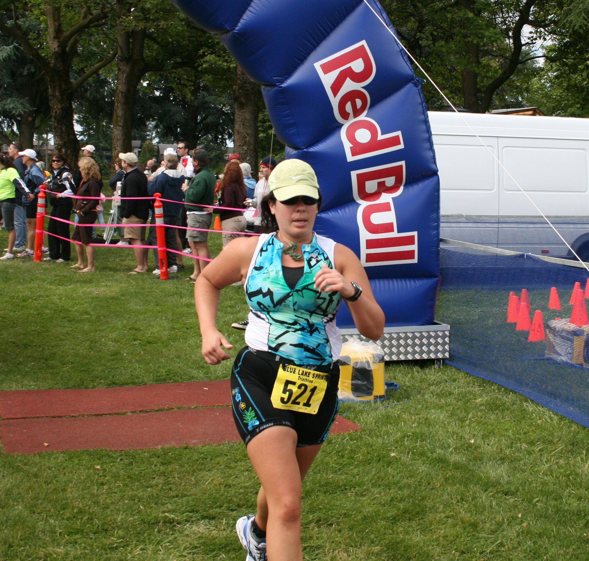 Comments: Well, running is by far my weakest event. I've been working on it a lot over the past year and while I've gone from a 13+ min/mi to a 10 min/mi, I'm just not fast. I saw one gal in my division pass me on the run right from the start and one had beat me in from the bike, so as far as I could tell, I was in third place. I felt a little defeated at that point because I was positive that I hadn't built enough of a lead to hold that position. Which looking back on is quite funny, because I never had any intention (nor thought I ever had any chance) of placing top three in my group. I don't know at what point it became important to me that day... Anyway, my strategy was still to not back off on pace until I puked. I never did puke, but I was extremely uncomfortable the whole time. At the turn-around point I saw what I thought was someone in my division. That kept me motivated for the second half of the run and I never let her pass me! I came into the finish chute feeling strong, but worn out. I think I left it all out there, which was my primary goal for the day. What would you do differently?: It would be nice to have more running talent, but this was another 5k personal best for me, so I think I'll just be happy with that and not wish for anything better right now. ![]() Post race