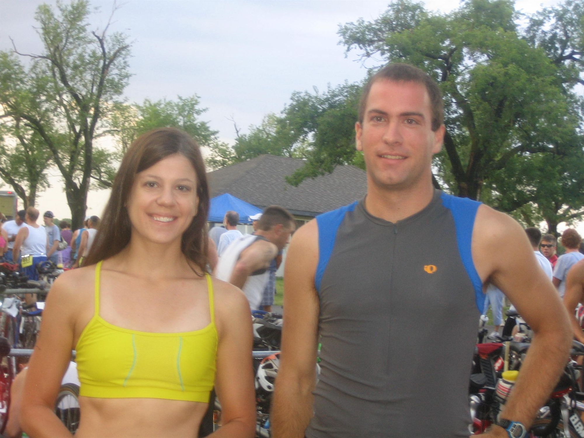 It started raining on my drive out to Lake Afton. Great. Got there, still raining but everyone was setting their stuff up anyway. Now it's lightning and thundering. Baaaah! Found Eric and racked next to him. Talked to a guy in the Tri Club (they were the ones who put on this race) about how many people had entered - in the 190s this year as opposed to just over 80 people last year. They were worried about rack space and Kenny had built some makeshift racks LAST NIGHT! Wow. Ran into some guys I went to high school with, Jason (El Flaco) and then my parents.