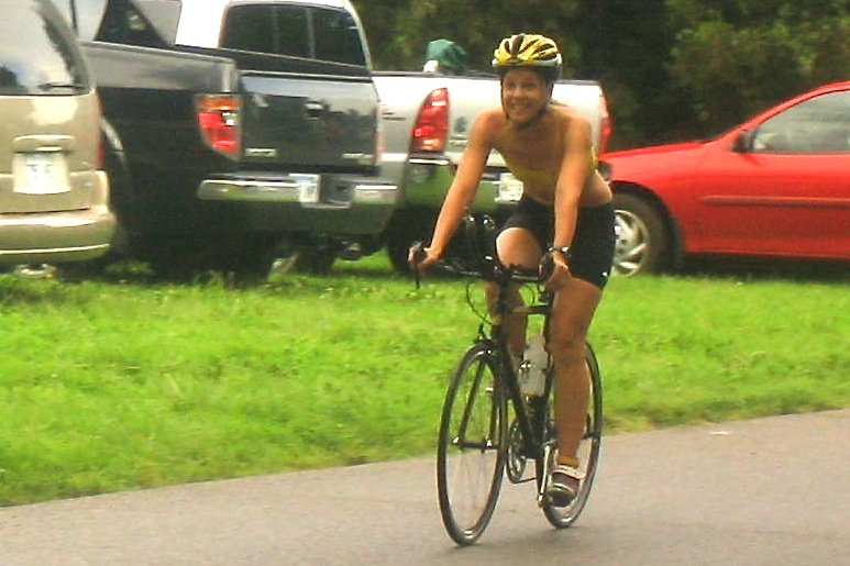 Comments: This bike course was UNBELIEVABLY FLAT! Oh goodness, this was awesome! There were some teeny-tiny rollers, but I would hardly even call them rollers. Immediately out of the gate, my bike computer did not work :( - When I got out to McArthur Rd, it started catching something, but it was really sporatic so I knew it wasn't accurate at all. So I had NO IDEA how fast I was going. I didn't need the distance either, because the course was marked at every mile which was nice. I'm actually thinking it was good that I didn't know how fast I was going because I just pushed it HARD the whole time. Sometimes when I know I've been going fast I will lay off, but today it was all out the whole time. Coming back in right before turning back into the park, I saw a girl in a pink jersey (remember this for later) in my age group. 25 years old. I've never ever been in a race situation where there was someone in my AG within reach of passing, and I had enough in me to pass them. I made her my prey and pushed it up a little hill to pass her - holy crap I just passed someone in my AG on the bike! First time that's ever happened in a race. I am usually the one getting passed! Sweeet. Rolled into transition and I was done. Still had no idea how fast I went. In the end, I met one of my long-term race goals (check my training log) of riding at least 18mph in a race. I am so proud that I did that. Also I thought it was hilarious that the "race marshall" was a guy from the Tri Club in a huge white minivan with his hazards on! Haha small race for ya. What would you do differently?: Nothing - I rocked this and beat a huge goal of mine. ![]() Transition 2