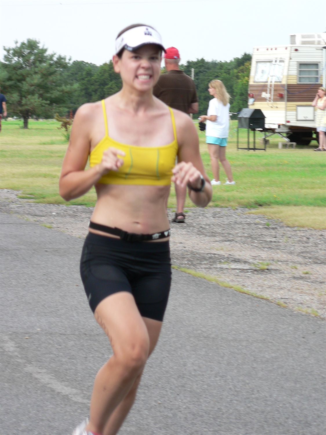 Comments: Legs felt great beginning the run! After a kind of disappointing run at Shawnee Mission I was DETERMINED to push myself to the point of exhaustion or vomiting today. Whichever came first. This was only a sprint, come on! At around the 1-mile mark, the girl in the pink jersey I'd passed on the bike freaking passed me! Nooooo! Dang it! I got kinda down because I knew that the run was usually a struggle for me physically, and then mentally when I see girls in my AG pass me I just get upset. I usually tell myself there's nothing I can do... I will never be as fast as they are. But today... today was different. Jason came running up right after this happened (holy crap Jason was done already!!) and said "use her... go off of her" - yeah she's in my AG! He yelled "It's only a 5K!" and I got super dooper motivated. I saw my parents right there too and I make a GRRRRRR grimmace face at the cameras kind of as a joke, but a very real "I am going to pass her" gesture. I meant it. I gave a big surge and came just up next to her. She kind of ran me to the edge of the road a little and said "oh I didn't see you there" or something. Yeah baby... I'M HERE! For a little bit, I would get a few steps ahead and then she would come up next to me. Screw this, I'm gonna pass her. I did, and I was hurting. Did I mention I was hurting? I was huffing and puffing and grunting like crazy! It was humid as all get-out... just some thick, thick air. I kept pushing and pushing, the whole time telling myself it was only a 5K. Got a little naseaus but told myself that's exactly where I need to be. I kept looking back at Pinky and she was still there! So I'd surge a little more to try and distance myself. I felt bad for looking back so many times, but I had no idea how much she had left in the tank. Coming up to the finish chute I looked back one last time and she was still there, probably 10 seconds behind me. I gave one last final push and I was done. I was completely spent. What would you do differently?: Nothing. I pushed harder than I've ever pushed in a race and it paid off. ![]() Post race