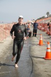 Comments: Matt took the timing chip hand-off, slapped the Velcro strap onto his ankle, and took off running with his bike. By the time I got my wetsuit off (with the help of my son, as I was starting to get queasy), made my way out the back side of the transition area and up the steps to Carlsbad Blvd, Matt had already biked past that point. I looked south along the bike route and could see the long steady incline that he would have to finish on. By now, there was a continual stream of activity along the road. On the west side of the divide, there were bikes just starting out, heading south, and bikes nearing T2 heading north. On the east side of the road there were runners just starting out, heading south, and runners nearing the finish heading north for the final 200 yards. By now, I figured I had at least 40-45 more minutes until our bike-man came back past me. So I took a seat on the guardrail and watched the parade. Soon I got a chance to see what was probably the first place finisher in the Elite Women's division. At the time, she was definitely moving faster than all those around her - a good strong finish. As I watched the bikes go by, about a hundred yards from the drop into T2, I noticed that almost all of them were moving pretty slowly. That long uphill finish was definitely having an effect on them. Then as the first of the Women's Age Group divisions started going by, the pace of the leaders was much faster, as one might expect from the more serious (and youthful) competitors. From my vantage point up on the bluffs above the beach I could see that the last of the swimmers were coming in, and soon the last of the bikes were going out. I could look south and see bikes and runners going all the way to the horizon. I could look north and see runners streaming into the finish arch. I though to myself, normally I'm still out there, among them, trying my hardest to gain on whoever might be in front of me. How odd it feels to be sitting here watching it like this, doing nothing more than working on my suntan. The thought of dashing out into the street and commandeering some poor dude's bike and getting back in the race kept tempting me. But the details of such a move would surely prove prohibitive. Getting the bike would be one thing, but then I'd also have to pull their shoes off. And then they'd have to be the correct size. No, it's best I say right here on the guardrail. Maybe just do a little stretching while I wait. Well 45 minutes came and went and there was no sign of Matt. What could be taking him so long? Flat tire? Crash? Speeding ticket? Then I looked down the hill into the transition area where, just a few minutes before, I'd seen Ryan, doing wind-sprints up and down the length of the parking lot as he was finishing his warm up. But I couldn't find him. I looked all over the transition area, and finally saw him. He was heading out onto the run course. Somehow I'd missed Matt going by me and he was already done. I hurried down to the racks and congratulated him for making it through his leg. Apparently I missed him because in the rush to get started, he forgot to take off his warm-up shirt, and wound up doing the whole thing in a big, over-sized sweatshirt, modified to short sleeves by having torn them off. He said he was most of the way through the race before he noticed that something was flapping around like crazy. Yeah, I'd been looking for a guy in a tri-suit, not a big floppy gray sweatshirt. Anyway, we were wondering what place we were in by now, but Matt assured me we weren't in first. He commented that while he was waiting for me to finish the swim, one of the guys who took off before him had been warming up on bike trainer he'd set up next to the racks. Crap, that sounds like a roadie. So someone else brought a ringer too. First Speedo-jammer-guy in the swim turns out the 4th fastest swim time of the day at 12:42, then bike-trainer-guy turns out the fastest bike time of the day by 44 seconds with a 36:11 - not bad for 25K. At least they were on separate teams. What would you do differently?: I probably wouldn't do anything differently, but then I wasn't doing the bike leg, so that doesn't count. As far as Matt's concerned, he might want to loose the sweatshirt before he un-racks his bike. Although I'm certain the time difference wouldn't have impacted our finishing place, I would expect that it did add time to his split. If not, then we are all definitely paying way too much for our sleek, wind-resistant tri-suits. ![]() Transition 2