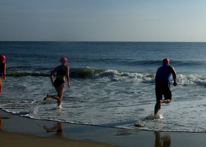 Comments: I made a huge mistake of swimming straight out for the first buoy. By the time I got there I had drifted 15 yards past it and had to swim against the current and 90 swimmers to get around the orange ball. I tried swimming straight - I sighted every 10th stroke, I alternated breathing from my left side (the side I'm comfortable breathing on - but the side facing out to sea) to my right side, but I was zig zagging pretty bad. Went out to sea once and had to be reigned inby a Kayak and went too far toward shore. Still passed a fair number of caps from the wave in front of me and a few from the wave in front off that. My guess is around 17 or 18 minutes for the half mile. What would you do differently?: Start up-current from the buoy. Also try to conrtrol my adrenaline. I took off like a wild man when the horn sounded - I was clearly ahead of everyone in my wave for the first 75 yards, by 100 yards I thought I was going to drown - I pushed way too hard all the way through the race - especially on the swim - killed me on the run ![]() Transition 1