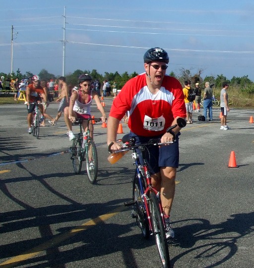 Comments: The hardest part of the whole race was leaving the water and getting to my bike. I ran so hard to get out of the water and then sprinted across the beach and up and over the dunes, when I reached the top of the dune I heard a loud pounding in my ears - I thought "well this is it, I'm going to die right here doing my first triathlon!". coming down the dune I ralized the pounding was the AC/DC they were playing over the loud speakers - but I was still way out of breath from the dune crossing. Did I mention I weigh 265 lbs? running all the way ot the back to get my bike and then all the way to the fron to get on it was a big disadvantage. What would you do differently?: I pulled the buckle right off my chin strap of my helmet I was so pumped up. I needed to calm down. My hands were shaking so bad it took , what seemed like - 20 minutes, to get the buckle re-threaded on the strap and get it on my head. Rough transition! ![]() Bike