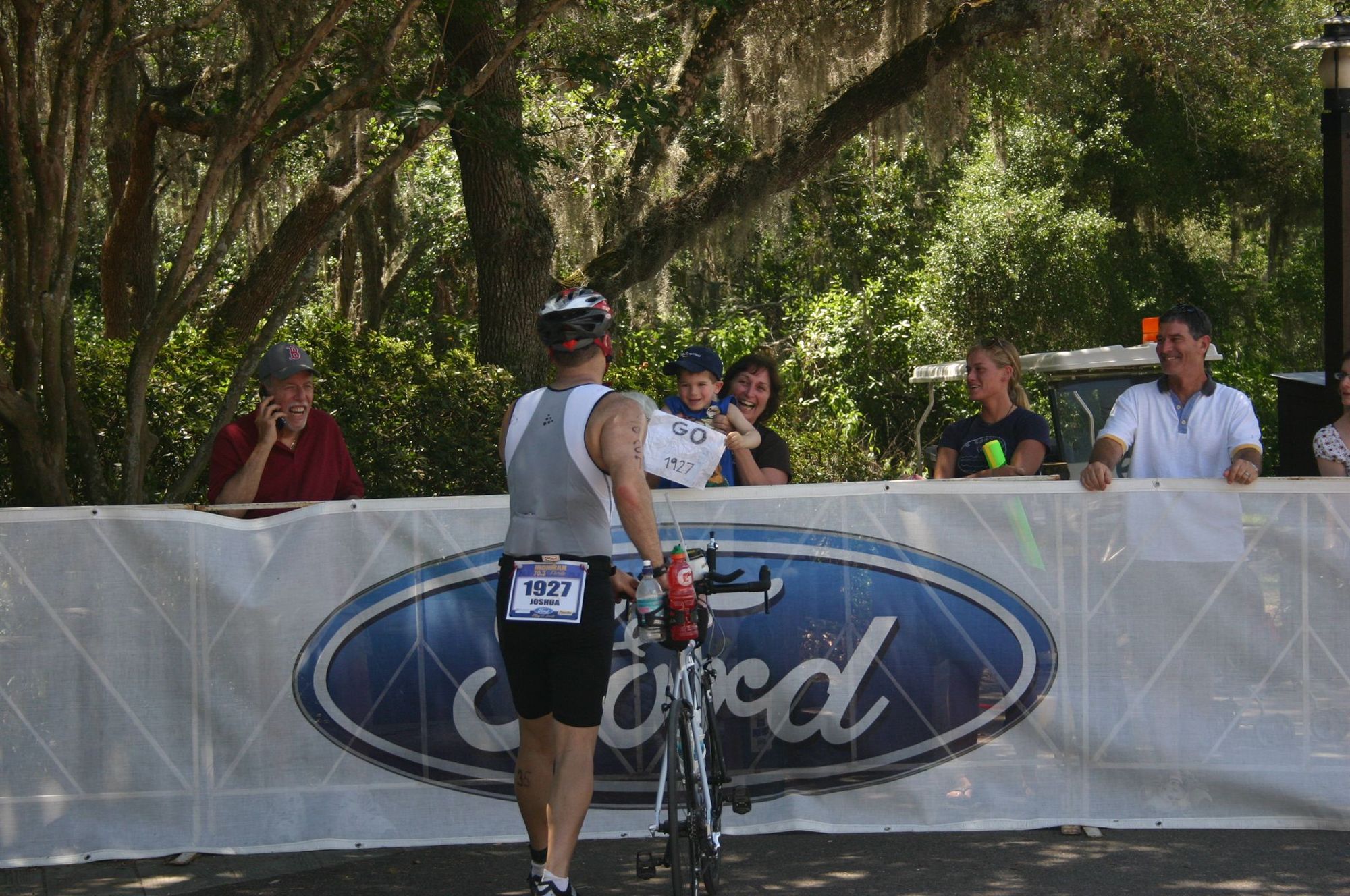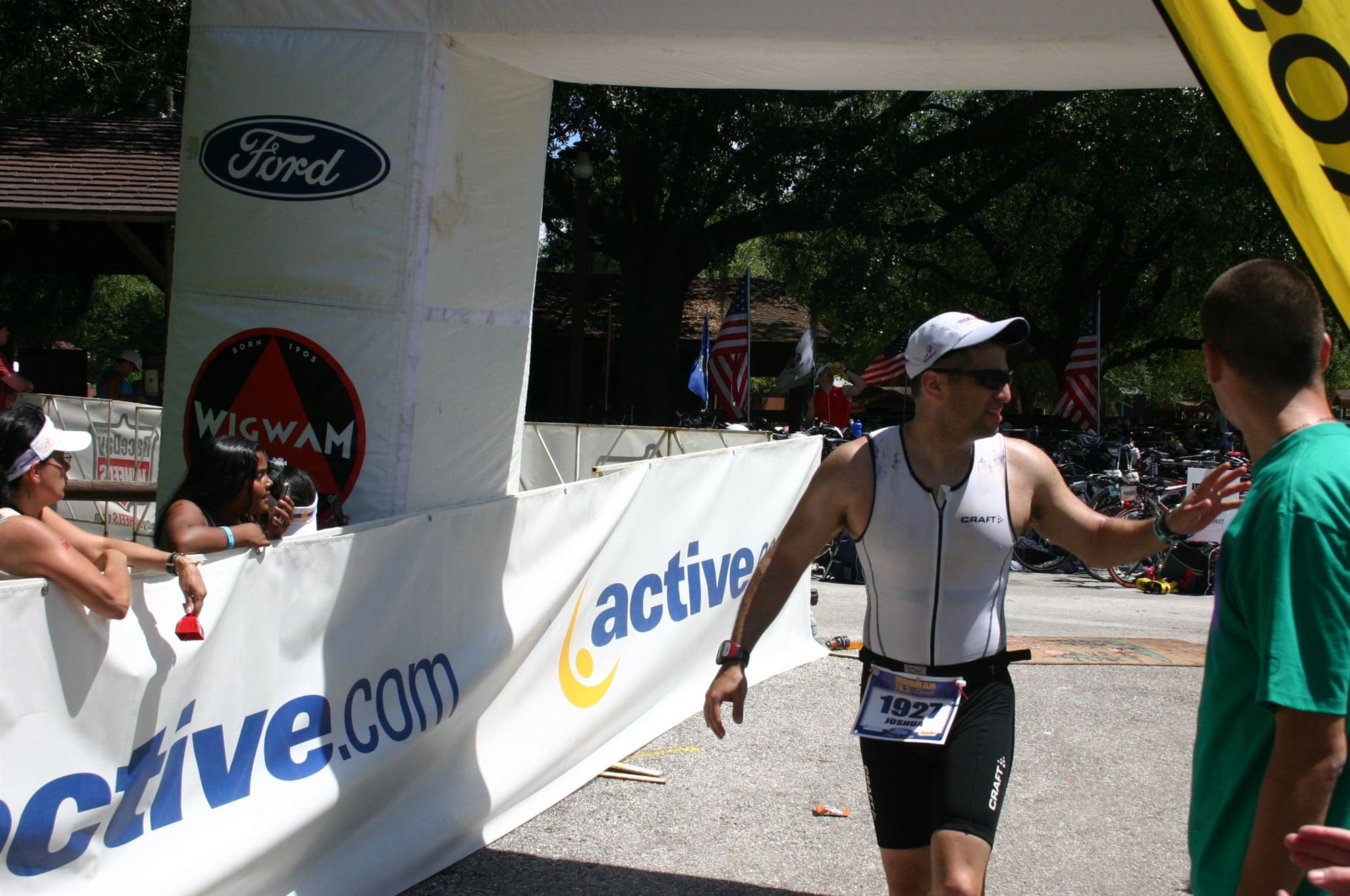 Comments: I got off the bike and walked gingerly up the shoot. Saw my mother on the right and she proceed to scream "Go Joshua, I love you." I had flashbacks of playing youth baseball with her screaming on the sidelines. I turned the corner and saw my father and son, who as holding up a sign and I almost lost it. As much as a pain in the a$$ it was with the whole family there leading up to it, it was worth it see them out in transition. I knew just from the short walk up the shoot it was going to be a long 13.1 miles. I walked over and kissed my son, who was being held up by a nice lady, who I have no idea was. I then kissed my wife and daughter and hobbled into transition. I rack the bike, put on a bandaid on the bottom of my foot where I get blisters, switched socks, took off the extra pair of tri shorts, grabbed the hat and was off. What would you do differently?: Nothing  Run
