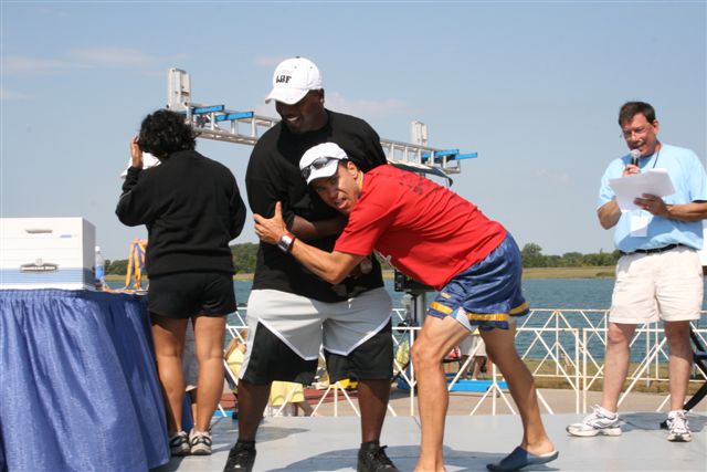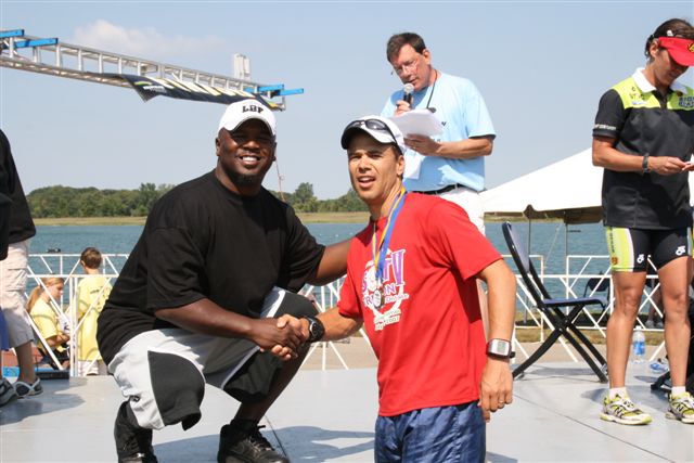 Warm down: Grab some gatorade and water. Wait for others to finish. Talked to Holly and discussed the race and how I missed her at the spot she was at last year. Stretched, had my Endurox and talked with other BTers. What limited your ability to perform faster: I really think I was a little dehydrated towards the end of the race. I didn't go to the bathroom until about noon and it wasn't clear. That was a mental mistake for sure, and I pride myself on taking care of the details. I tend to be hard on myself, but I like to find the things I did wrong, so I can improve on them next time. I am very excited about this PR (10' in an Oly is phenomanal). I know there is still room for improvement, though. And that is what makes this sport so great. I will get better. I really enjoyed the race, and it is a great set up in that you get to see so many people throughout it. Took 2nd in my AG, so that was very cool. Got to meet Leroy Butler and take a few pictures with him and Lauren Jensen. Event comments: Good race. Large field with some great talent. They really but on a great show and have a great gift bag, too. Some people weren't big fans of the fleece, but Holly loves it (yes, she got mine). They are weak, however, on the post race food. Very weak. Last updated: 2008-07-22 12:00 AM