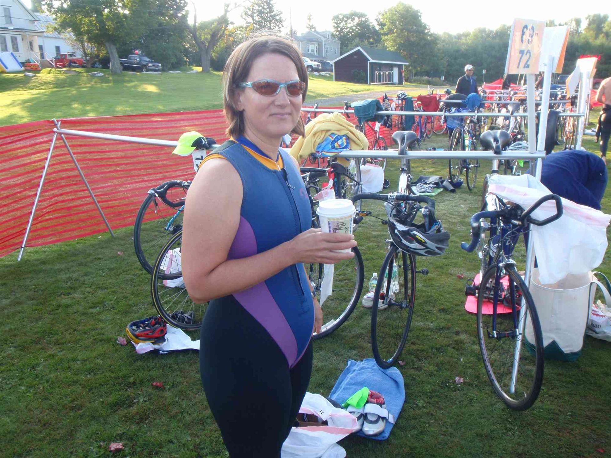 Rode my bike to local coffee shop to get my crucial first cup of coffee. Chatted with lots of people, jumped around to stay warm. It was shady and breezy which means cold. I was shivery, and I didn't want to get in the water too early.